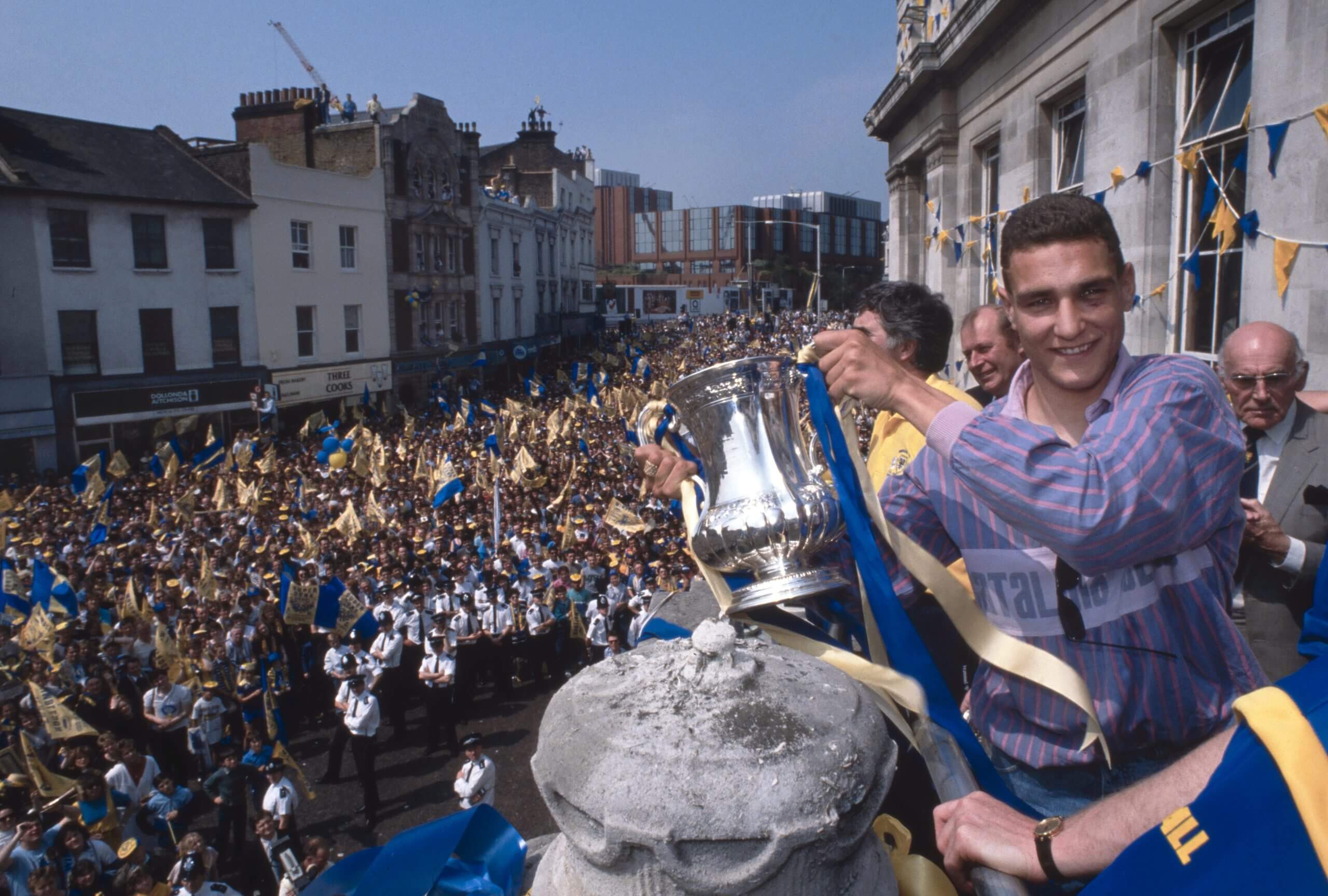Vinnie Jones and his team-mates celebrate their FA Cup final triumph in Wimbledon town centre in 1988 (Pascal Rondeau/Allsport/Hulton Archive/Getty Images)