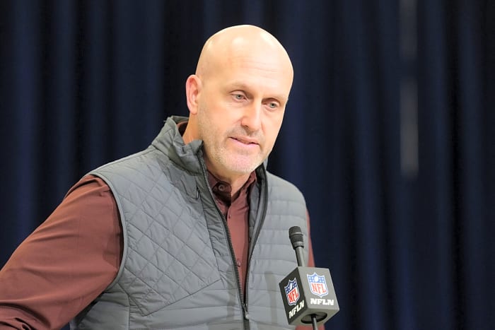 Feb 24, 2026; Indianapolis, IN, USA; Arizona Cardinals general manager Monti Ossenfort speaks at the NFL Scouting Combine at the Indiana Convention Center. Mandatory Credit: Kirby Lee-Imagn Images