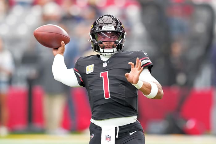 Oct 5, 2025; Glendale, Arizona, USA; Arizona Cardinals quarterback Kyler Murray (1) warms up before their game against the Tennessee Titans at State Farm Stadium. Mandatory Credit: Joe Camporeale-Imagn Images