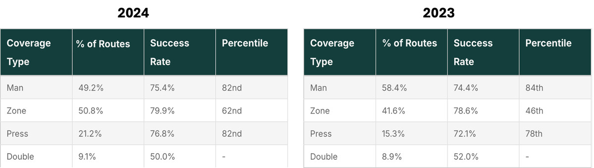 The only way to really limit Nabers was to double-cover him. He “only” got open 50% of the time when doubled, and he was doubled 24 times. The only WRs in the current RP database to be doubled as much or more were McConkey (24 times, 54% success), Harrison (28 times, 61% success), and Davante Adams (30 times, 57% success). No other wide receiver tracked thus far by RP was doubled any more than 15 times. That’s probably a feature of the database not yet being complete – in 2023 Justin Jefferson led the NFL in being doubled (52 times, 71% success), followed by Adams (42 times, 79% success), Garrett Wilson (41 times, 80% success), and Ja’Marr Chase (40 times, 70% success). Jefferson, Wilson, and Chase have not yet been tracked for 2024.
