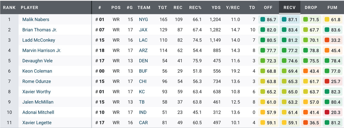So the question is no longer whether Malik Nabers was a good draft pick. Clearly he was. The bigger question is: How good can he become? For the record, Nabers finished ninth in Pro Football Focus receiving grade among all wide receivers with at least 50 targets last season, behind Puka Nacua, Nico Collins, A.J. Brown, Mike Evans, St. Brown, Drake London, Tee Higgins, and Justin Jefferson. Fans tend to be suspicious of PFF grades, which are subjective, but it’s hard to disagree with that list as the current royalty of NFL receivers. In yards, Nabers was 11th, in yards per reception tied for 32nd, and in TDs tied for 18th.