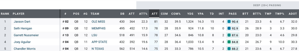 Dart’s 90.9 PFF grade, 21 BTTs, and 6 TWPs didn’t lead all college QBs, but they were still really good. Go routes were a staple of Nabers’ diet at LSU, and his quarterback there, Jayden Daniels, led the nation in deep passes in PFF’s metrics his final year.