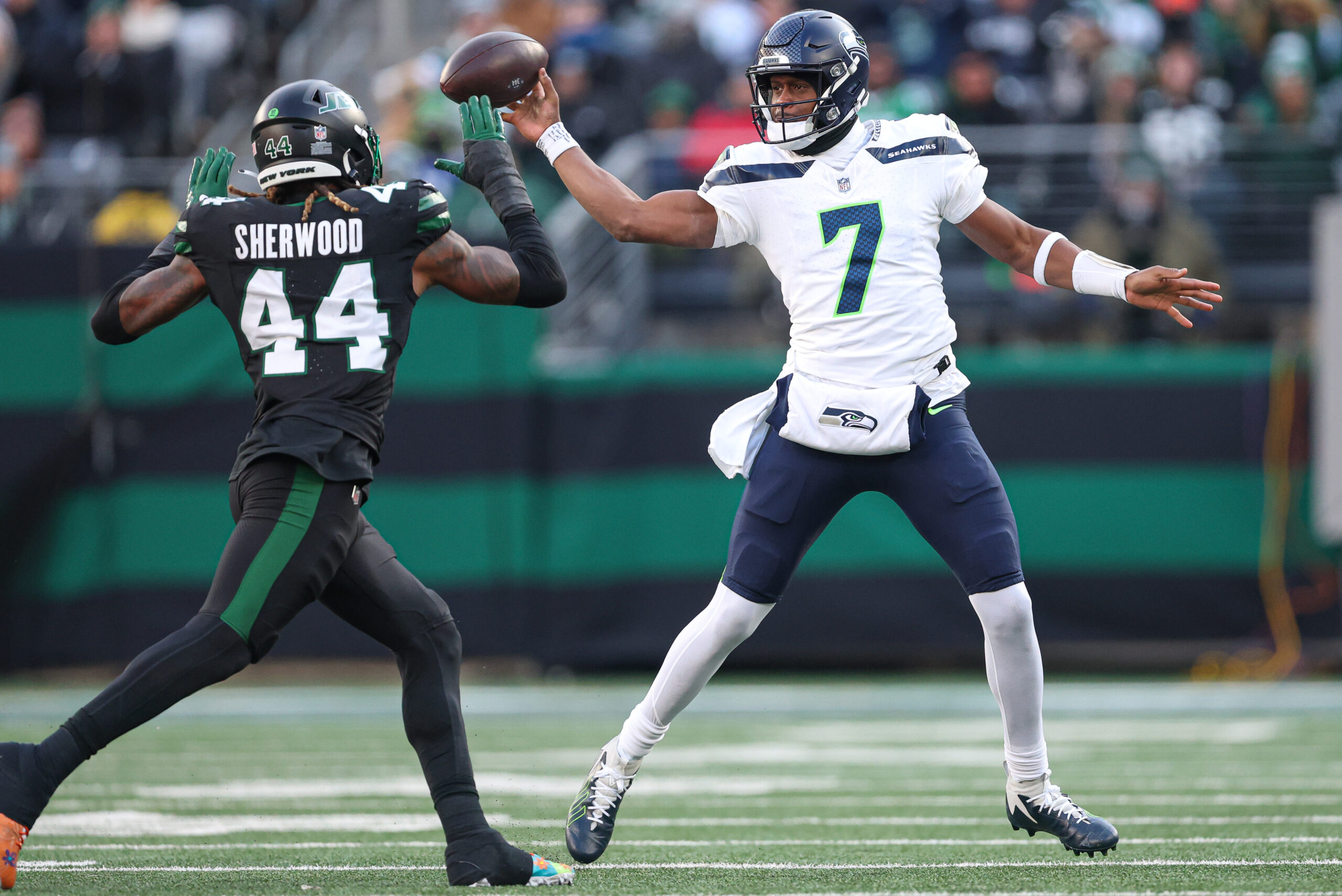 Dec 1, 2024; East Rutherford, New Jersey, USA; New York Jets linebacker Jamien Sherwood (44) knocks down a pass by Seattle Seahawks quarterback Geno Smith (7) during the first half at MetLife Stadium. Mandatory Credit: Vincent Carchietta-Imagn Images