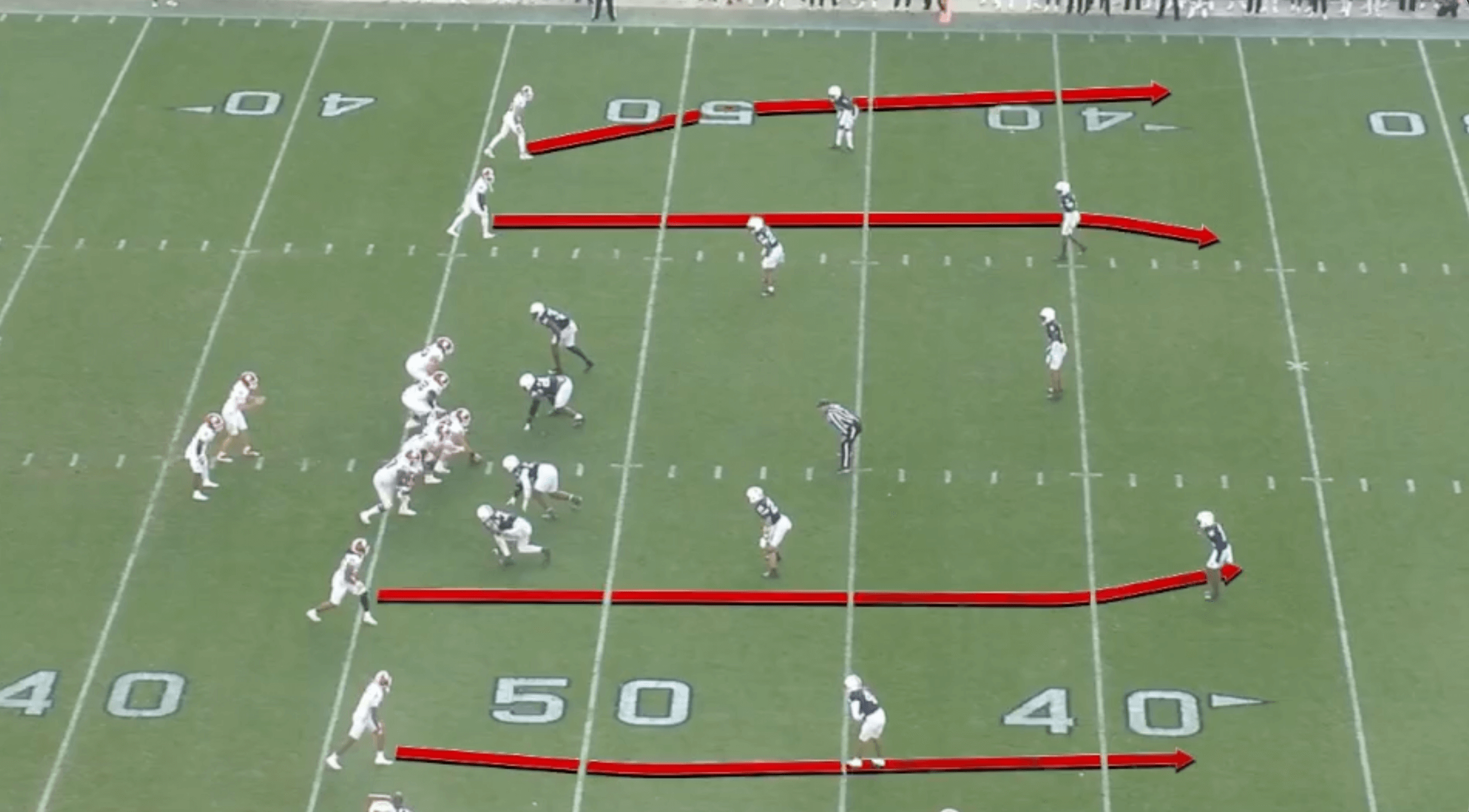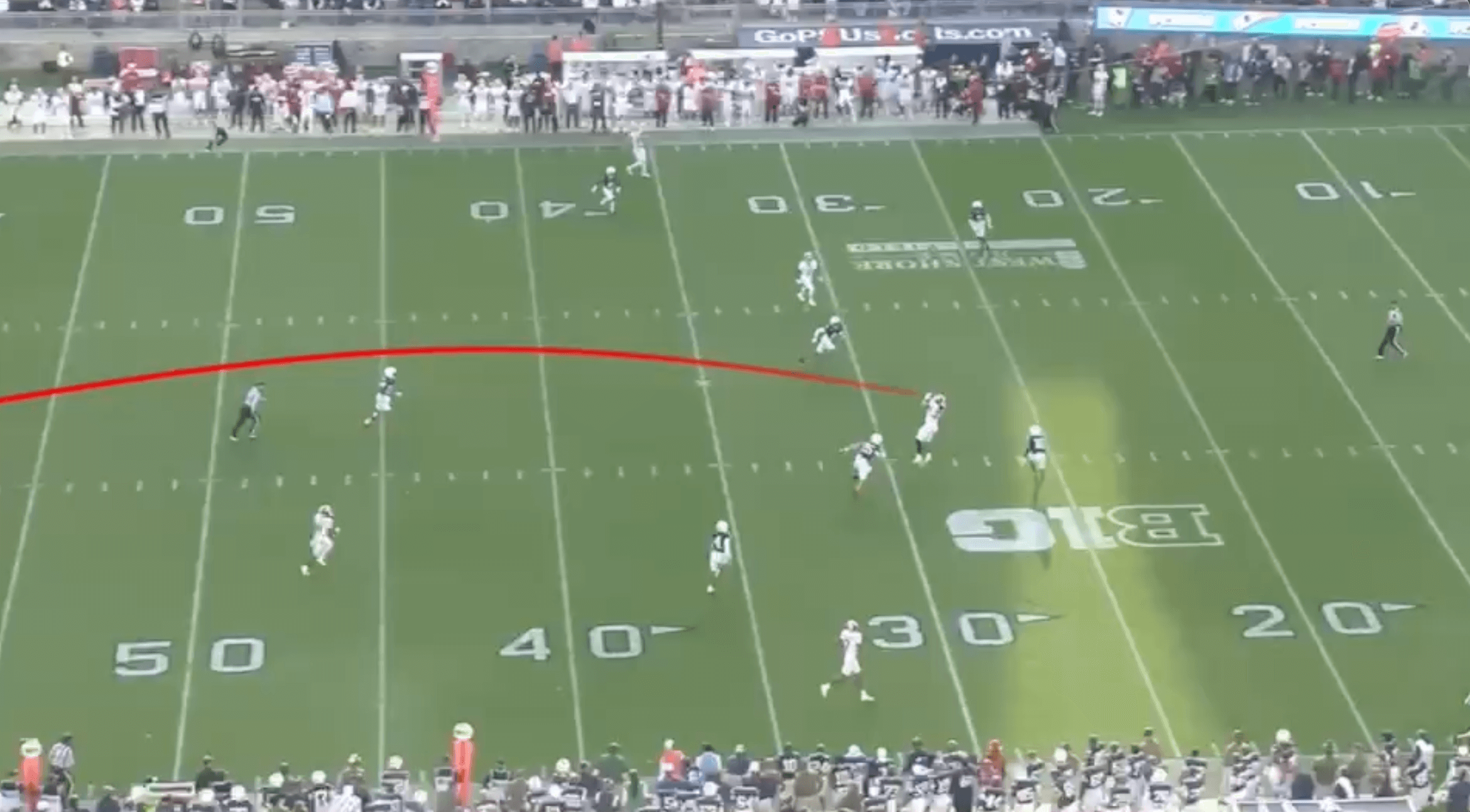 The first time Indiana called “four verts,” Penn State played cover 3 zone. Mendoza stared down the safety to keep him in the middle of the field. He finished his drop, didn’t take a hitch, and delivered a perfect throw down the seam in rhythm for 22 yards to Omar Cooper Jr.