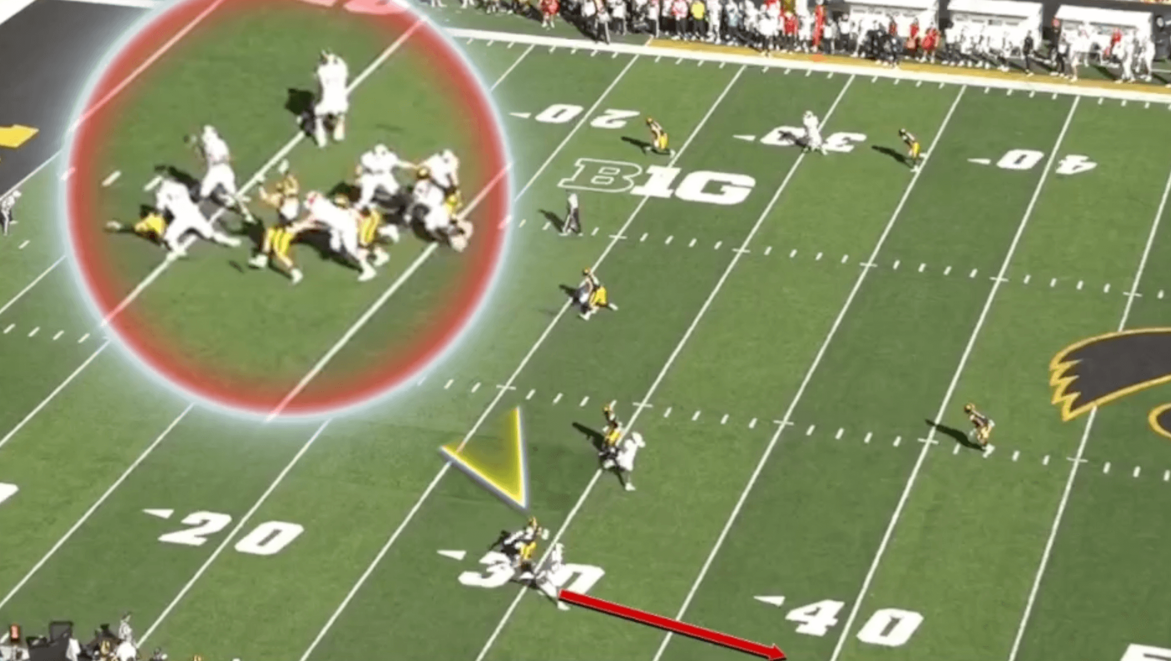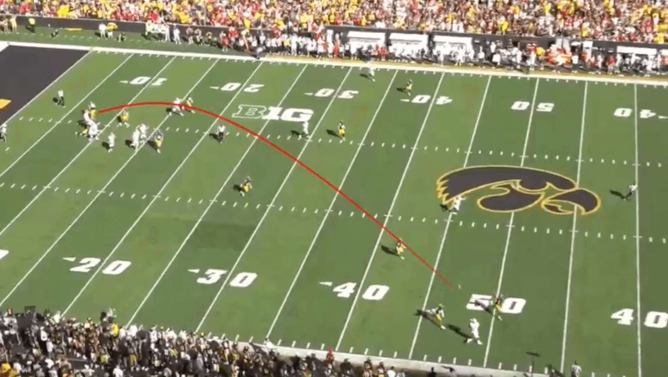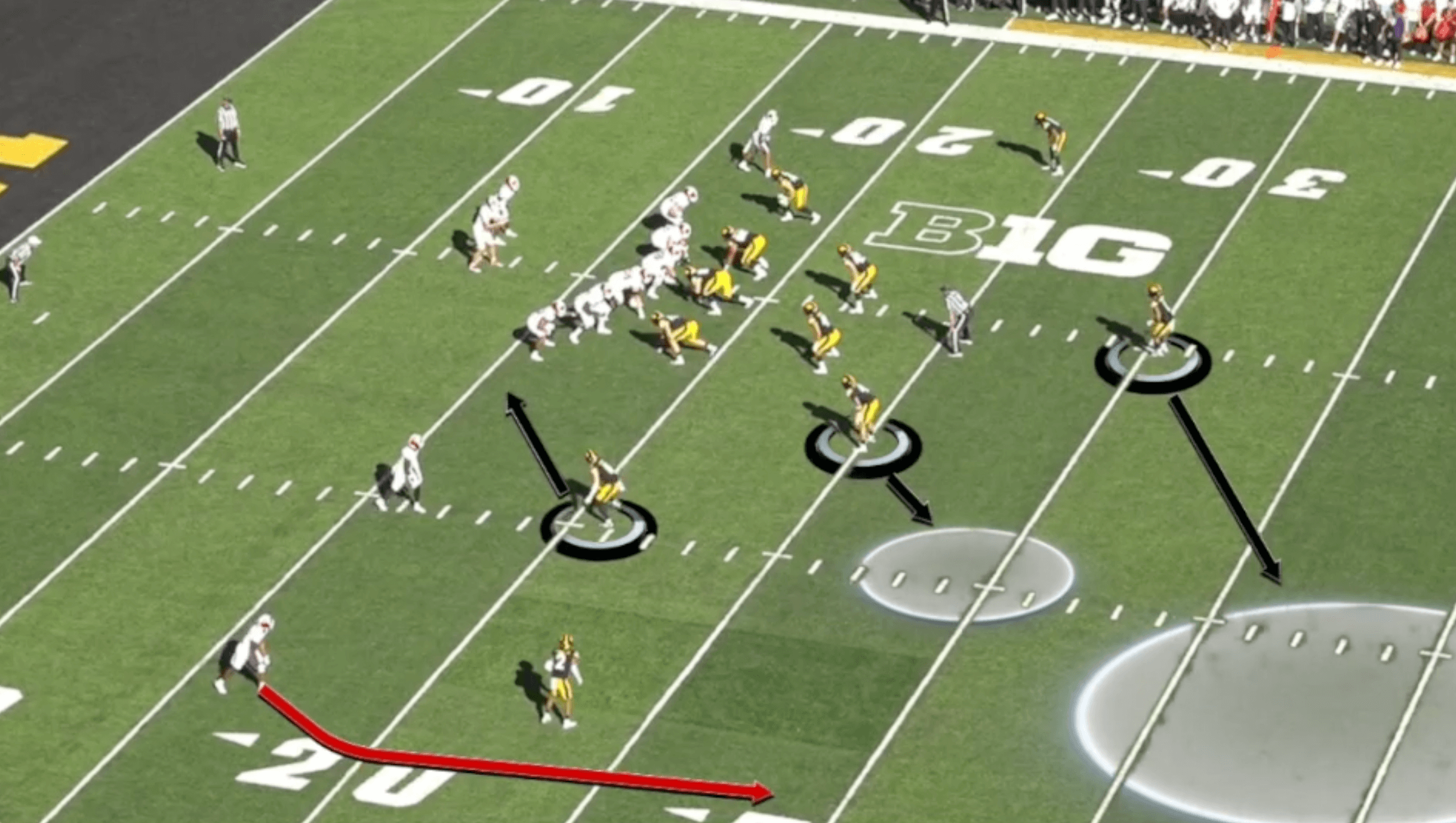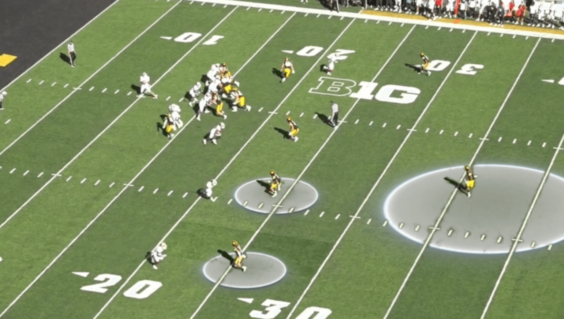 Iowa initially gave a single-high man look, but they would actually blitz the nickel and rotate into a cover 2 zone to the wide side of the field.