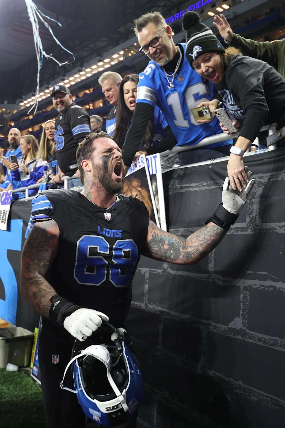 Taylor Decker celebrates and high-fives fans after the Detroit Lions’ win against the Minnesota Vikings at Ford Field on Jan. 5, 2025 in Detroit.