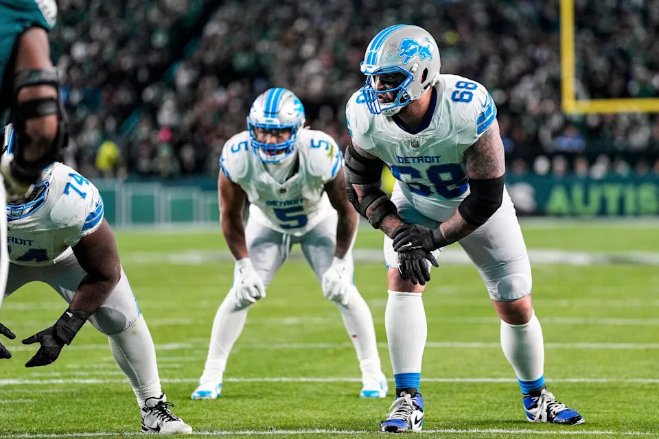 Detroit Lions offensive tackle Taylor Decker (68) gets ready for a play against Philadelphia Eagles during the second half at Lincoln Financial Field in Philadelphia on Sunday, November 16, 2025.