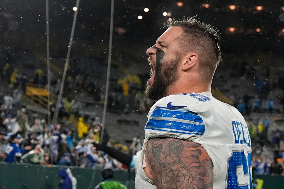 Detroit Lions left tackle Taylor Decker celebrates the 24-14 win over the Green Bay Packers as he exits the field at Lambeau Field in Green Bay, Wisconsin, Sunday, Nov. 3, 2024.