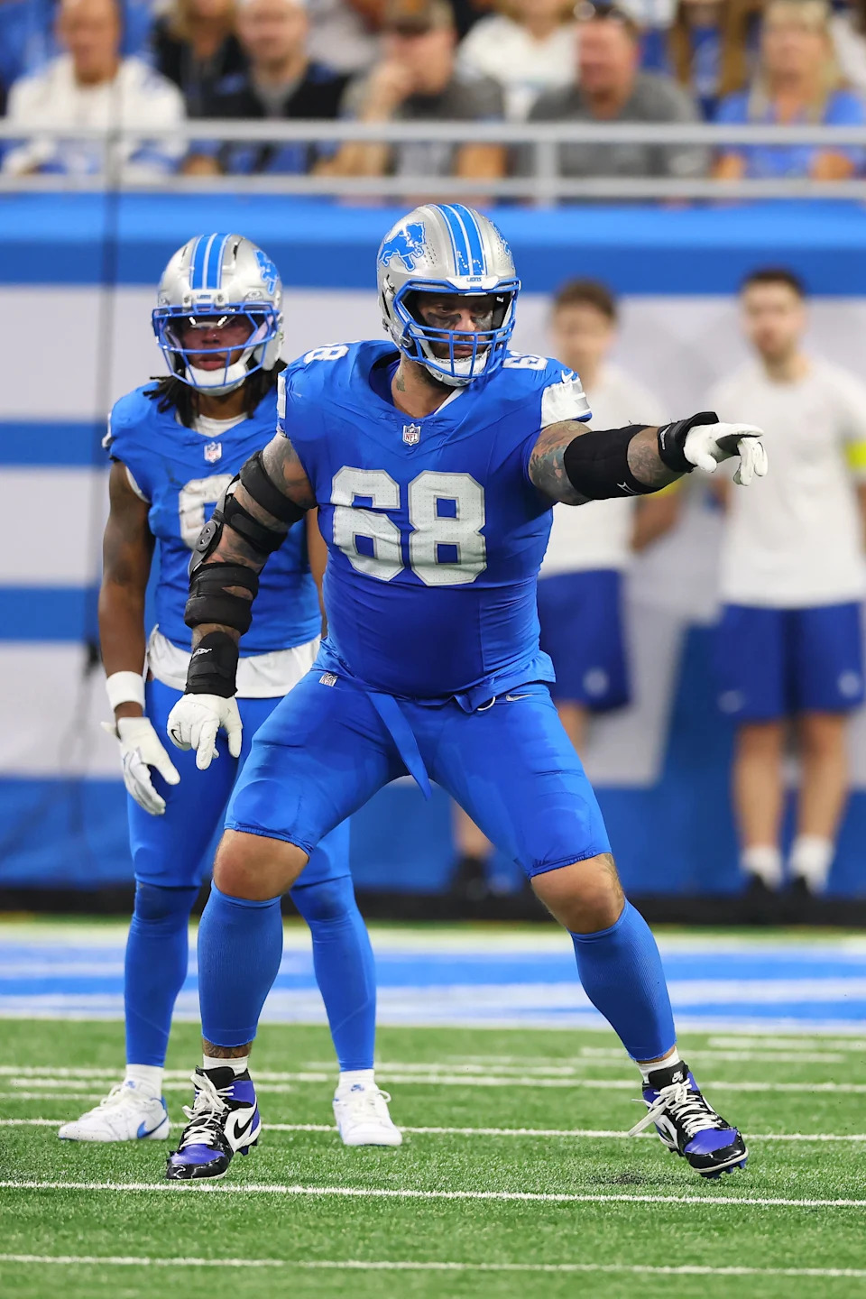 Nov 2, 2025; Detroit, Michigan, USA; Detroit Lions tackle Taylor Decker (68) enters the field before the game against the Minnesota Vikings at Ford Field. Mandatory Credit: David Reginek-Imagn Images