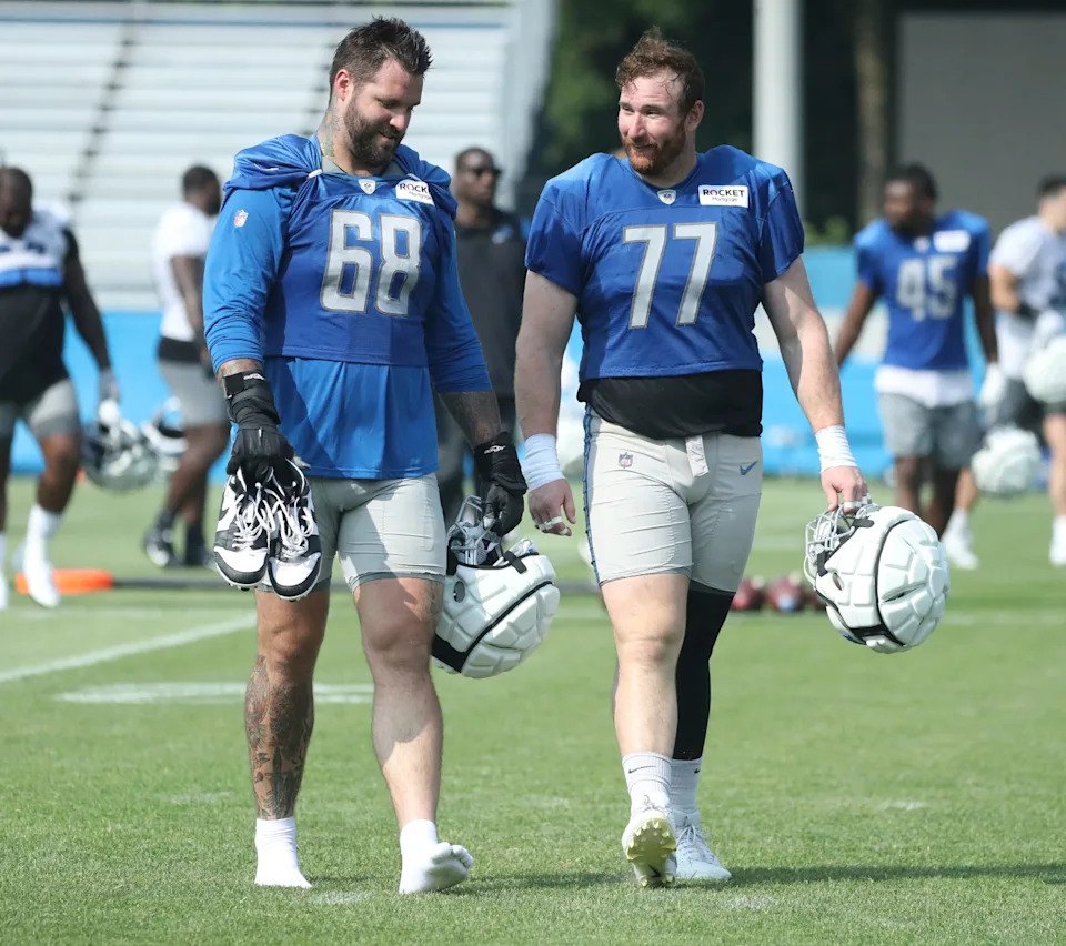 Detroit Lions offensive tackle Taylor Decker (68) and center Frank Ragnow (77) walk off the field after training camp Wednesday, July 26, 2023.