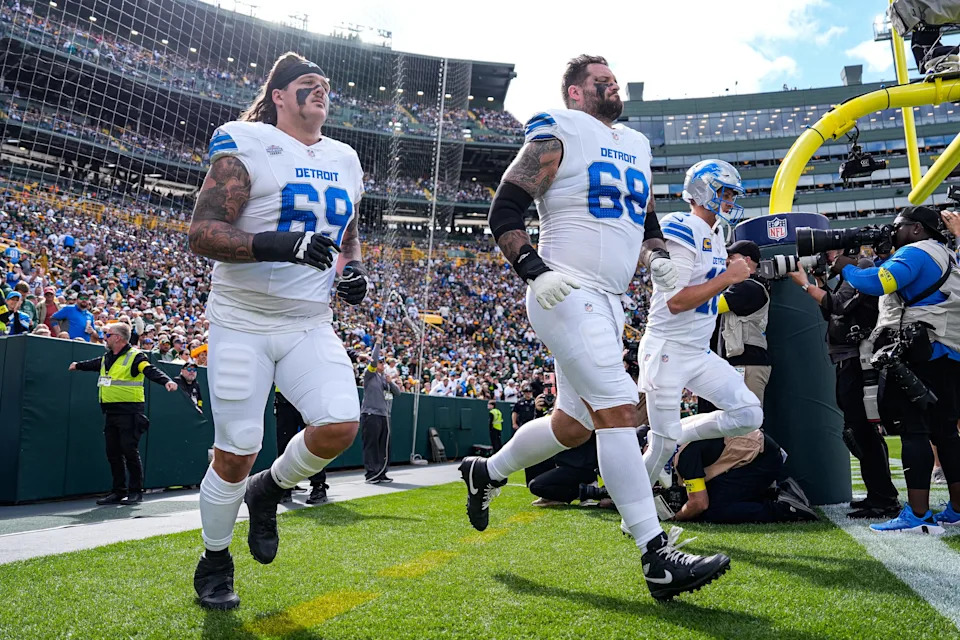 Detroit Lions guard Tate Ratledge (69), tackle Taylor Decker (68) and quarterback Jared Goff (16) take the field for the first half against the Green Bay Packers at Lambeau Field in Green Bay, Wis., on Sunday, September 7, 2025.
