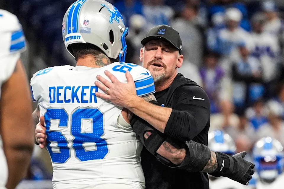 Detroit Lions head coach Dan Campbell hugs offensive tackle Taylor Decker (68) during warmup before the Dallas Cowboys game at Ford Field in Detroit on Thursday, Dec. 4, 2025.