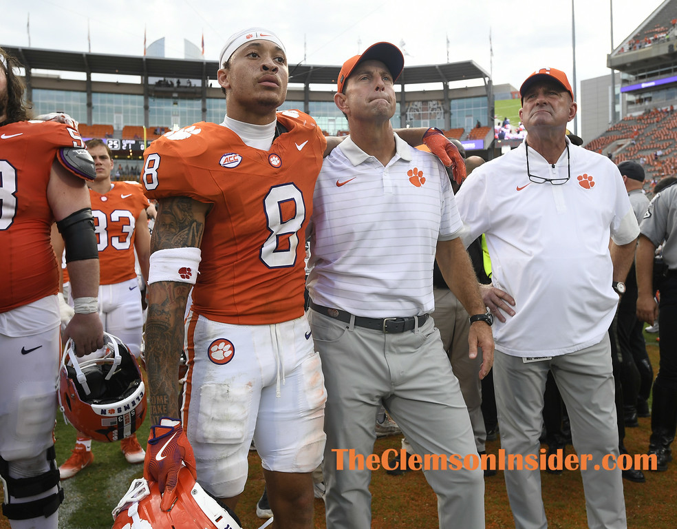 Clemson head coach Dabo Swinney stands with cornerback Avieon Terrell at midfield after Clemson’s loss to Syracuse on Saturday, Sept. 20, 2025 at Memorial Stadium in Clemson, S.C. (Bart Boatwright/The Clemson Insider)