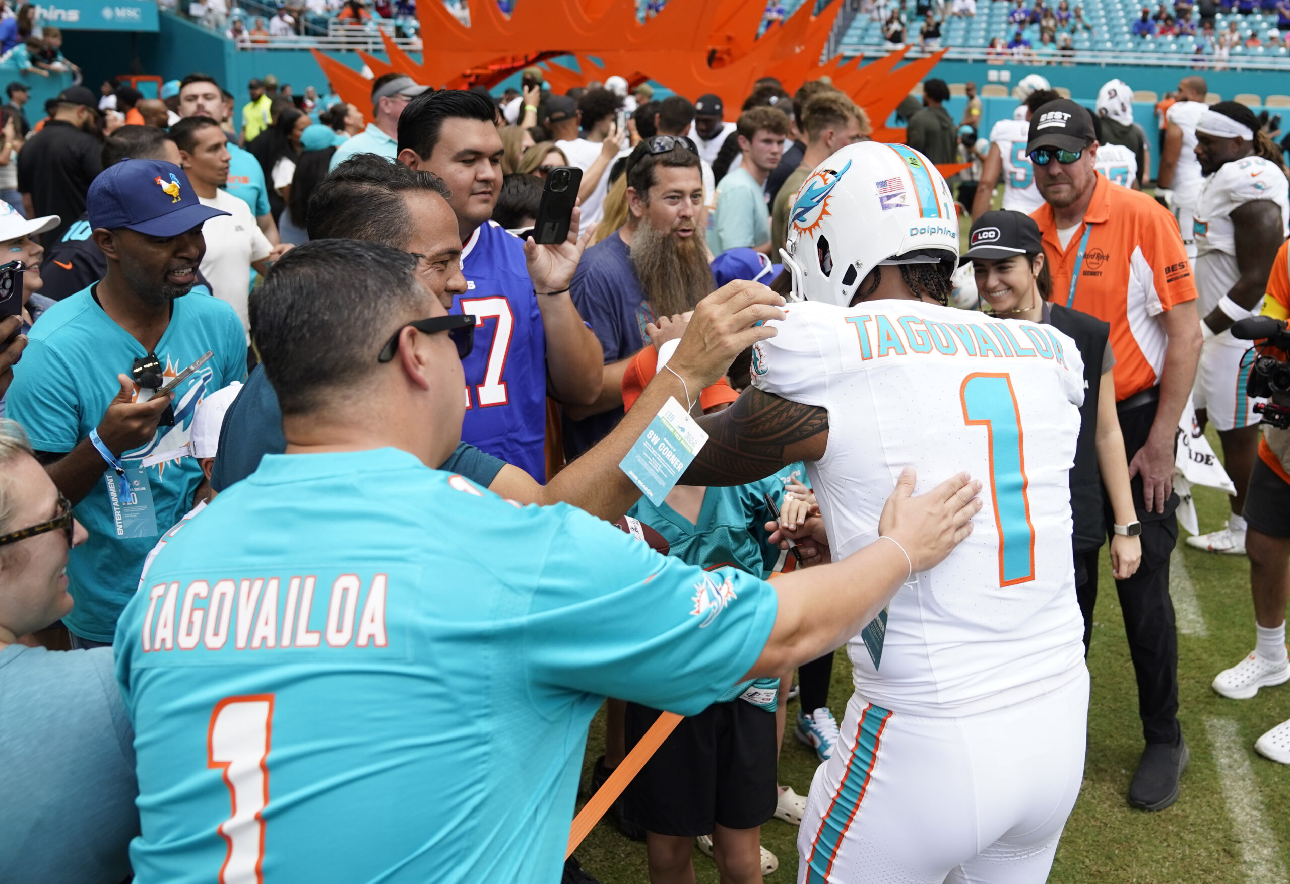 Nov 9, 2025; Miami Gardens, Florida, USA; Miami Dolphins quarterback Tua Tagovailoa (1) greets fans before a game against the Buffalo Bills at Hard Rock Stadium. Mandatory Credit: Jeff Romance-Imagn Images