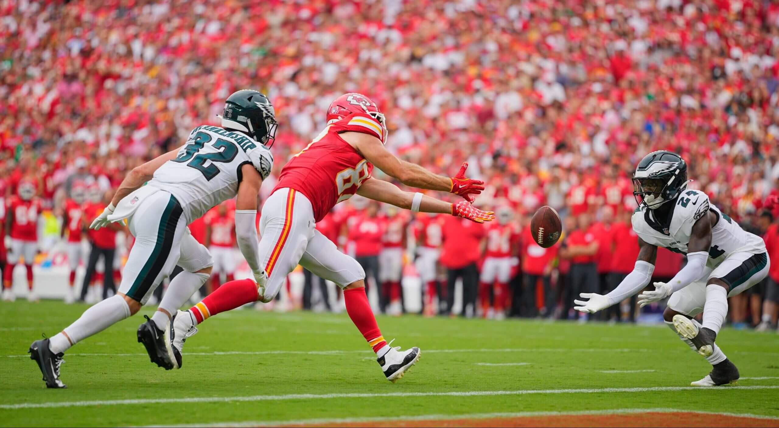 Travis Kelce watches a pass deflect off his hands into those of Eagles safety Andrew Mukuba near the end zone in Week 2. It wouldn’t be the only time that happened to Kelce in 2025. (Jay Biggerstaff / Imagn Images)