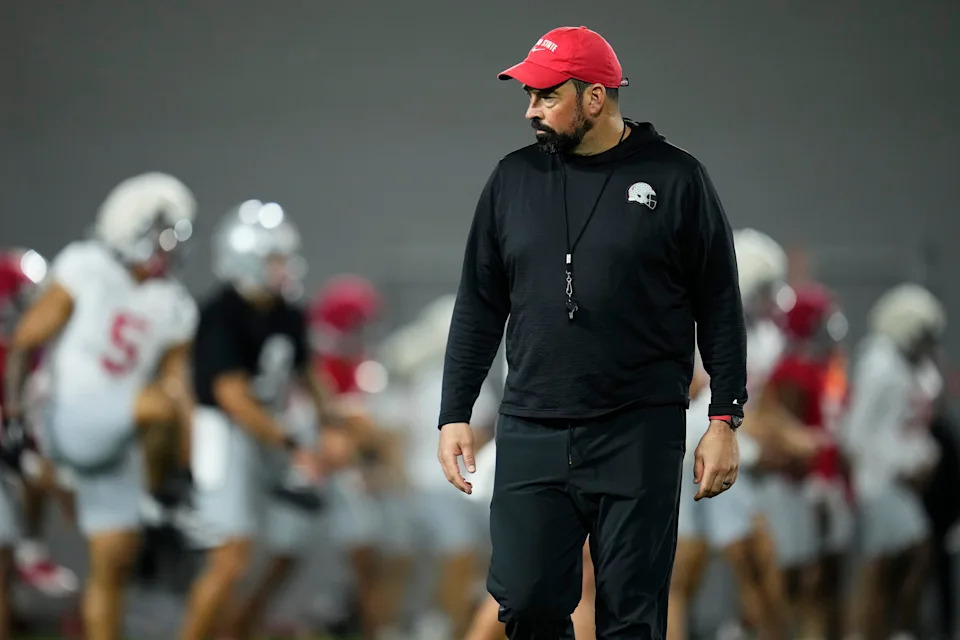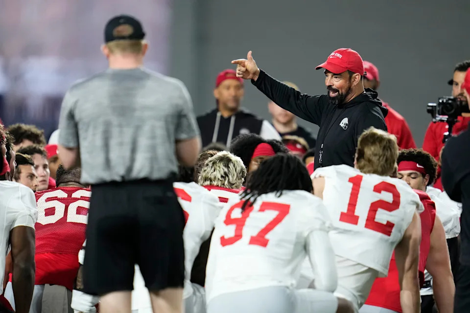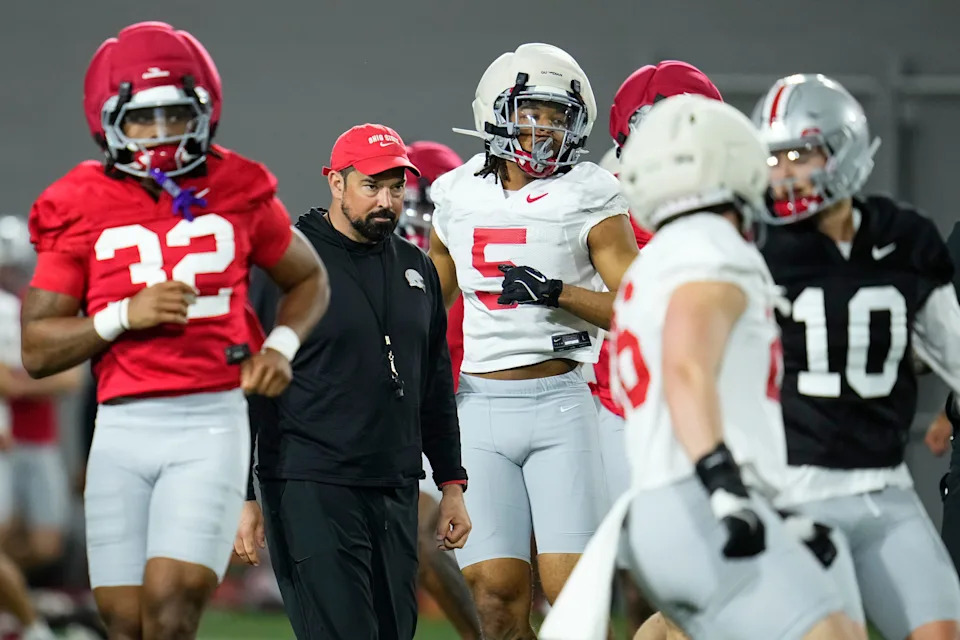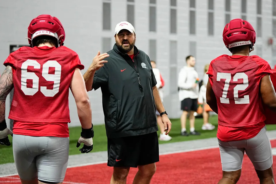 Ohio State Buckeyes head coach Ryan Day leads the first day of spring workouts for the 2026 football season at Woody Hayes Athletic Complex in Columbus on March 10, 2026.