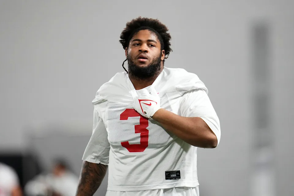 Ohio State Buckeyes defensive tackle James Smith (3) warms up during the first day of spring workouts for the 2026 football season at Woody Hayes Athletic Complex in Columbus on March 10, 2026.