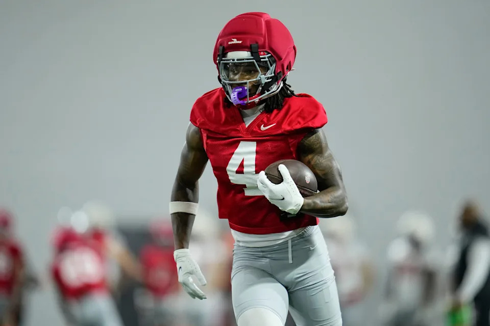 Ohio State Buckeyes wide receiver Jeremiah Smith (4) runs during the first day of spring workouts for the 2026 football season at Woody Hayes Athletic Complex in Columbus on March 10, 2026.