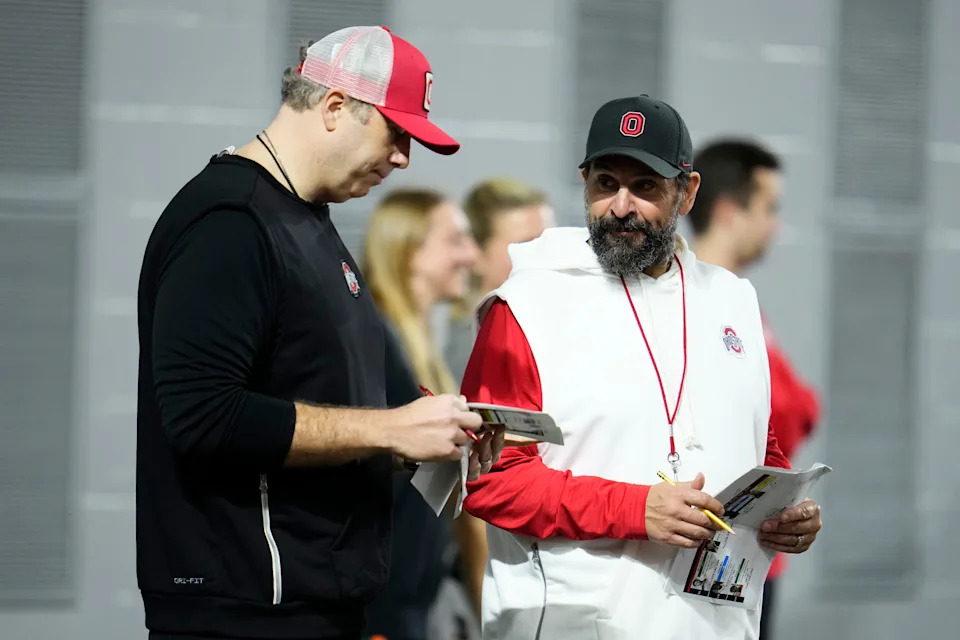 Ohio State Buckeyes offensive coordinator Arthur Smith, left, talks to defensive coordinator Matt Patricia during the first day of spring workouts for the 2026 football season at Woody Hayes Athletic Complex in Columbus on March 10, 2026.