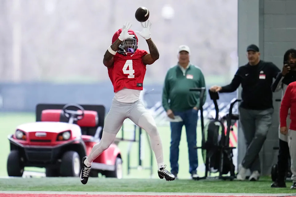 Ohio State Buckeyes wide receiver Jeremiah Smith (4) catches a pass during the first day of spring workouts for the 2026 football season at Woody Hayes Athletic Complex in Columbus on March 10, 2026.