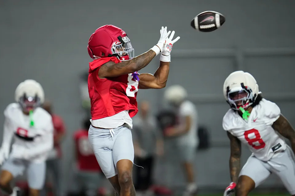 Ohio State Buckeyes wide receiver Chris Henry Jr. (15) catches a pass during the first day of spring workouts for the 2026 football season at Woody Hayes Athletic Complex in Columbus on March 10, 2026.
