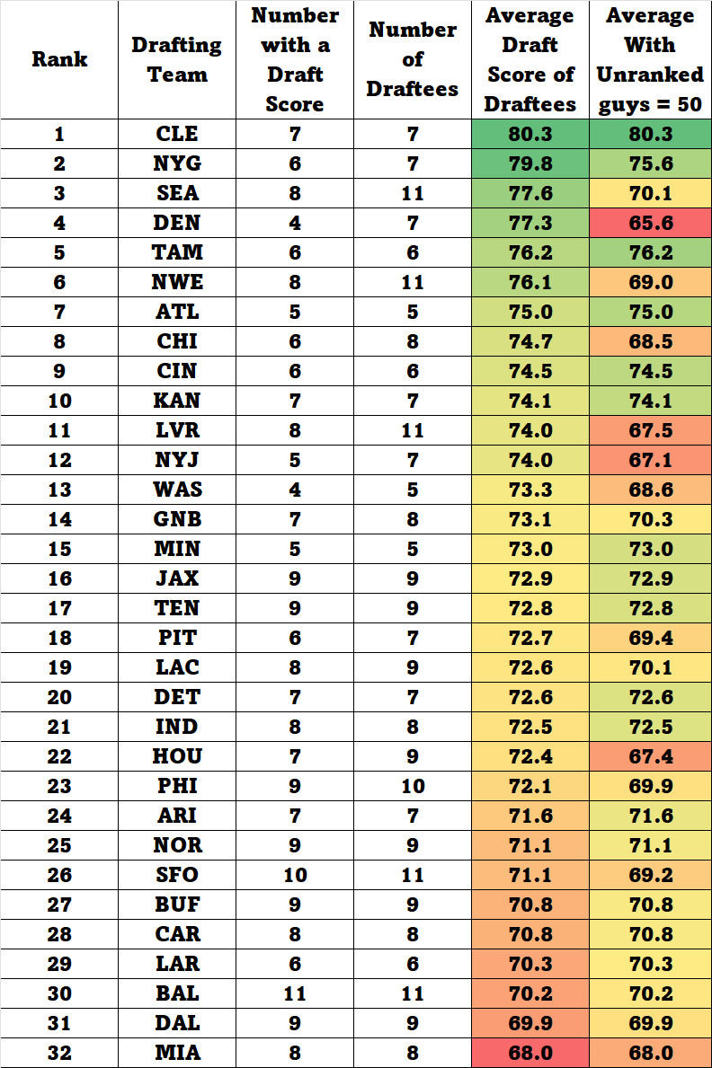 The average for the Bronco draftees was 77.3. The Browns 80.3 was the best. All seven of the Browns draftees got a draft score. Like the Broncos, the Seahawks drafted three players who did not have a score, as did the Raiders. I ran the numbers with and without the guys with a draft score. For the guys who did not have a score, I gave them a score of 50, which is the lowest possible. Doing that drops the Broncos average from 4th to dead last, from 77.3 down to 65.6.