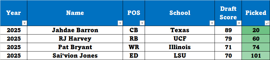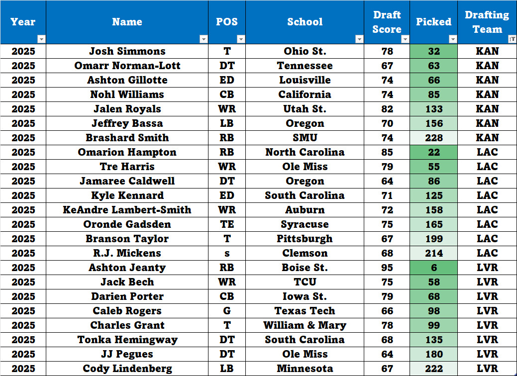 The rest of the AFC West draft (removing unscored guys) is shown below. The Chiefs got their highest graded player with the 133rd pick, but the Chargers and the Faiders got their highest scored player with their first picks. KC was desperate for OL talent in a year with limited OT and IOL talent. Simmons was the fifth OT picked in the 2025 draft (another draft where the Broncos failed to pick a single OT – nine years in a row).