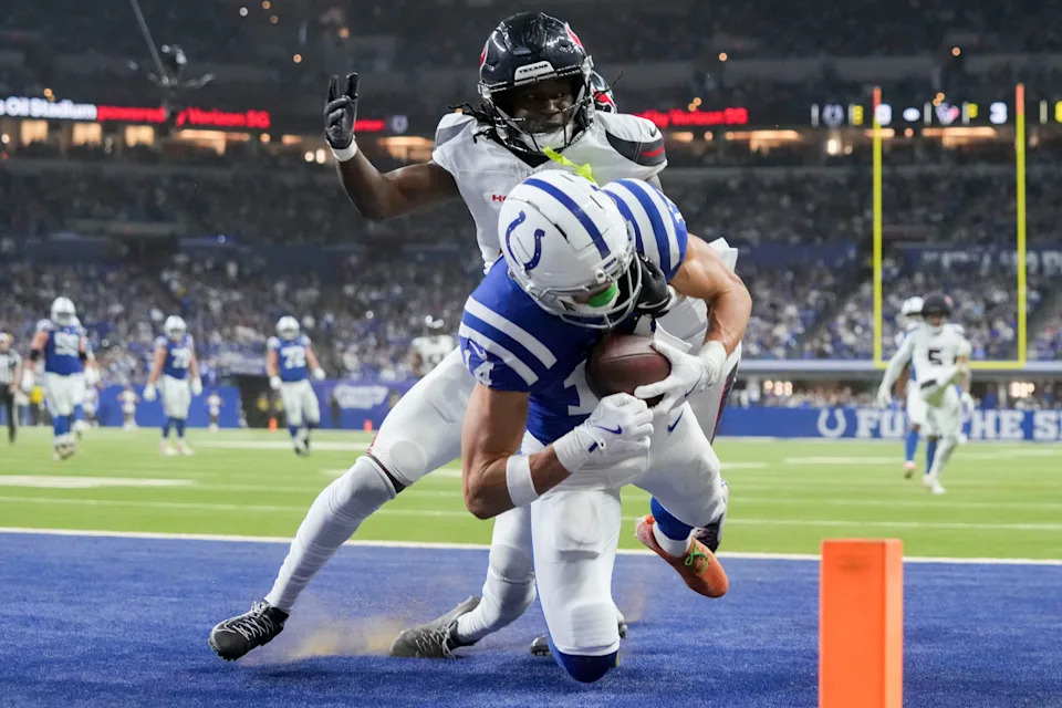 Nov 30, 2025; Indianapolis, Indiana, USA; Indianapolis Colts wide receiver Alec Pierce (14) makes a catch in front of Houston Texans cornerback Kamari Lassiter (4) for a touchdown during a game at Lucas Oil Stadium. Mandatory Credit: Grace Hollars-USA TODAY Network via Imagn Images
