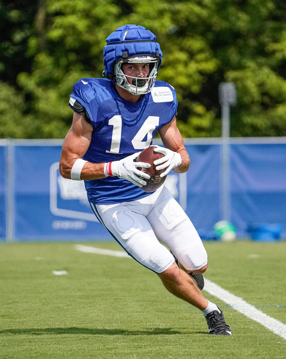 Indianapolis Colts wide receiver Alec Pierce (14) makes a catch during Colts Camp at Grand Park on Sunday, August. 4, 2024, in Westfield Ind.