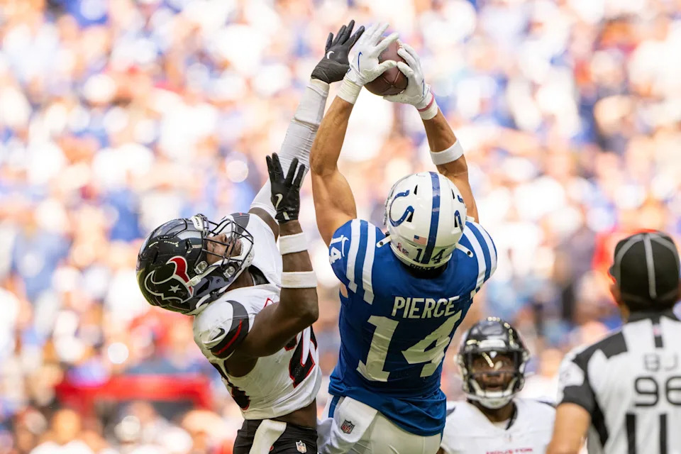 Sep 8, 2024; Indianapolis, Indiana, USA; Indianapolis Colts wide receiver Alec Pierce (14) catches a long pass under coverage from Houston Texans safety Jimmie Ward (20) during the second half at Lucas Oil Stadium. Mandatory Credit: Marc Lebryk-Imagn Images