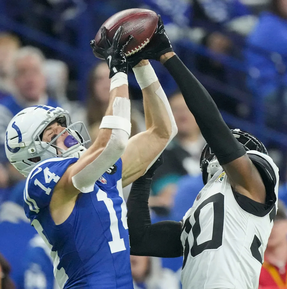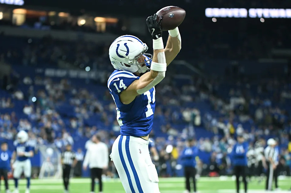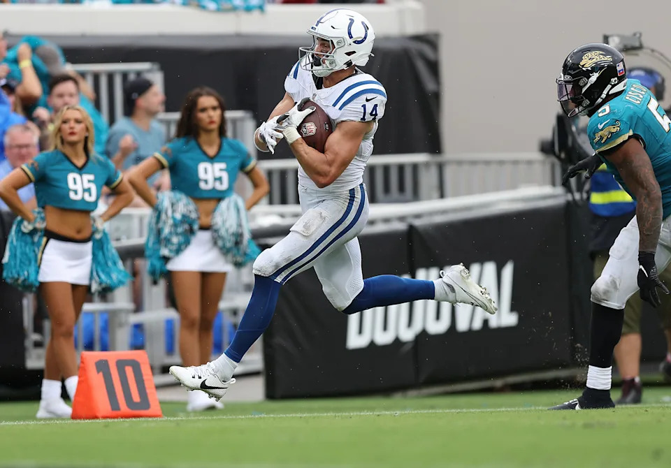 JACKSONVILLE, FLORIDA – OCTOBER 06: Alec Pierce #14 of the Indianapolis Colts catches a touchdown pass during the fourth quarter against the Jacksonville Jaguars at EverBank Stadium on October 06, 2024 in Jacksonville, Florida. (Photo by Mike Carlson/Getty Images)