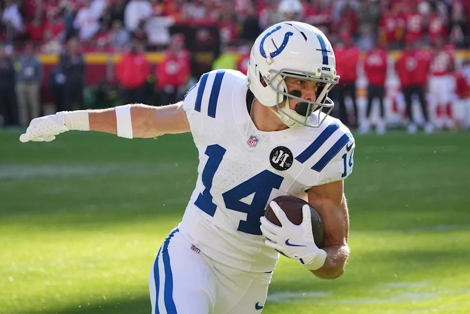 Indianapolis Colts wide receiver Alec Pierce (14) signals a first down during a game against the Arizona Cardinals on Sunday, Oct. 12, 2025, at Lucas Oil Stadium in Indianapolis. The Colts defeated the Cardinals 31-27.