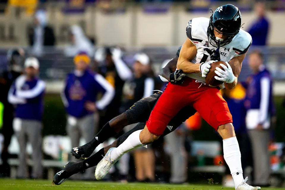 Cincinnati Bearcats wide receiver Alec Pierce (12) catches a pass as East Carolina Pirates cornerback Ja’Quan McMillian (21) tackles him in the first half of the NCAA football game between the Cincinnati Bearcats and the East Carolina Pirates at Dowdy-Ficklen Stadium in Greenville, NC, on Friday, Nov. 26, 2021.