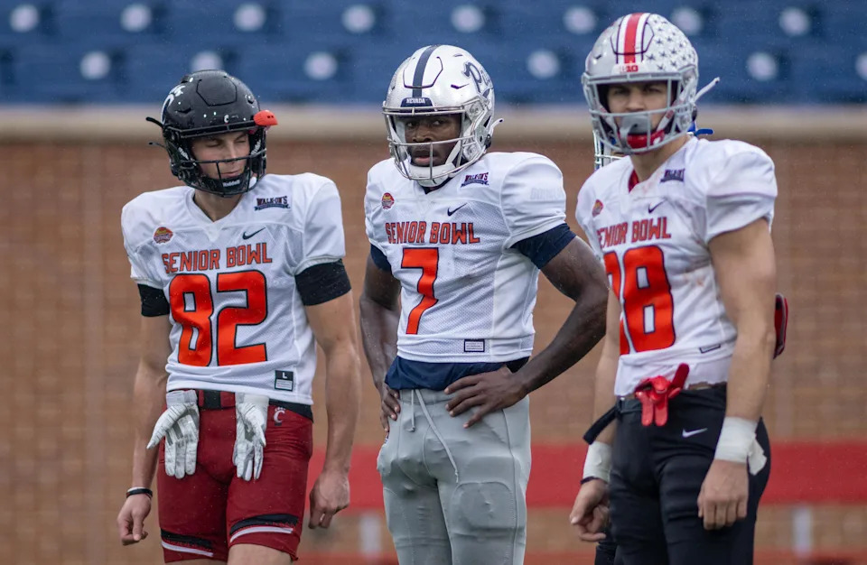 Feb 2, 2022; Mobile, AL, USA; National squad wide receiver Alec Pierce of Cincinnati (82) and National squad wide receiver Romeo Doubs of Nevada (7) and National squad tight end Jeremy Ruckert of Ohio State (88) during National team practice for the 2022 Senior Bowl at Hancock Whitney Stadium. Mandatory Credit: Vasha Hunt-USA TODAY Sports