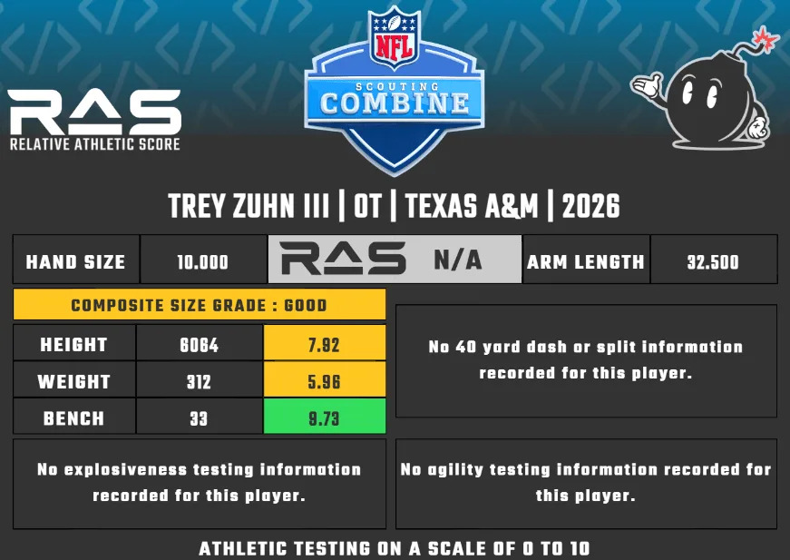Texas A&M left tackle Trey Zuhn III probably won’t be able to play tackle in the pros, his arms are likely too short and a liability against NFL pass rushers. Zuhn has spent most of his college career on the edge for the Aggies, but did play some at center this year. He handled the move well, and the interior could be his new home in the NFL.