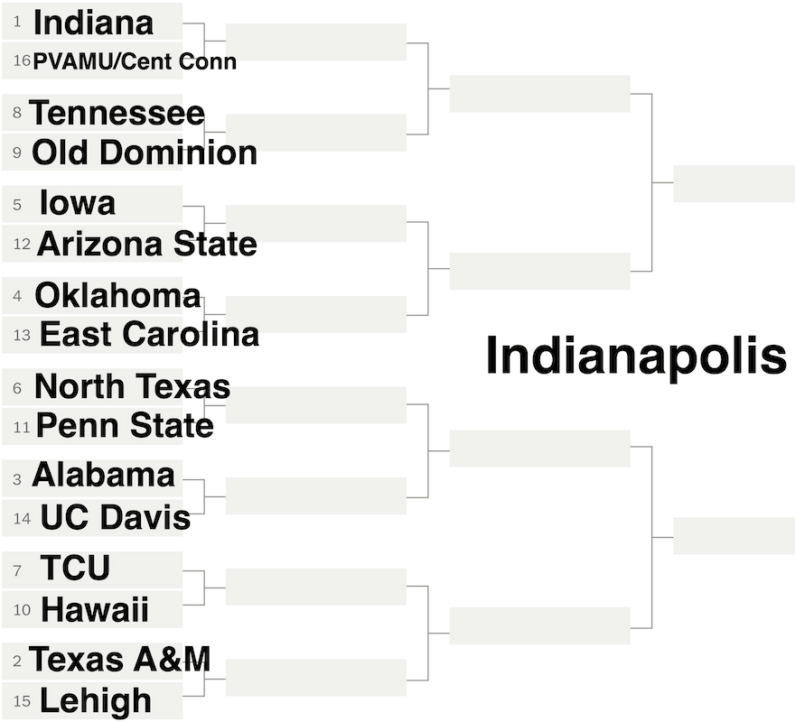 We have an Indianapolis region, which means the Hoosiers get to host in their home state. Does this setup mean all of these games happen in Indy, or just the final rounds? I dunno, the format changes every year. Call me the BCS.