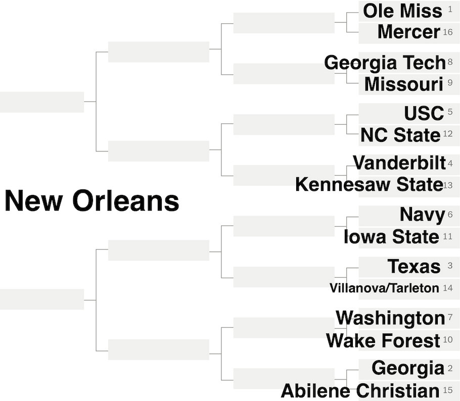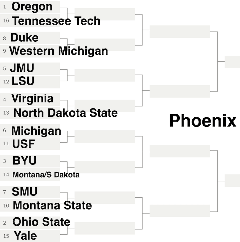 Next, in Phoenix, overall No. 4 seed Oregon winds up with friendly-ish geography, having been to the Fiesta Bowl four times. So many culture clashes in this group. Duke will somehow win it, despite losing four times in a single-elimination tournament.