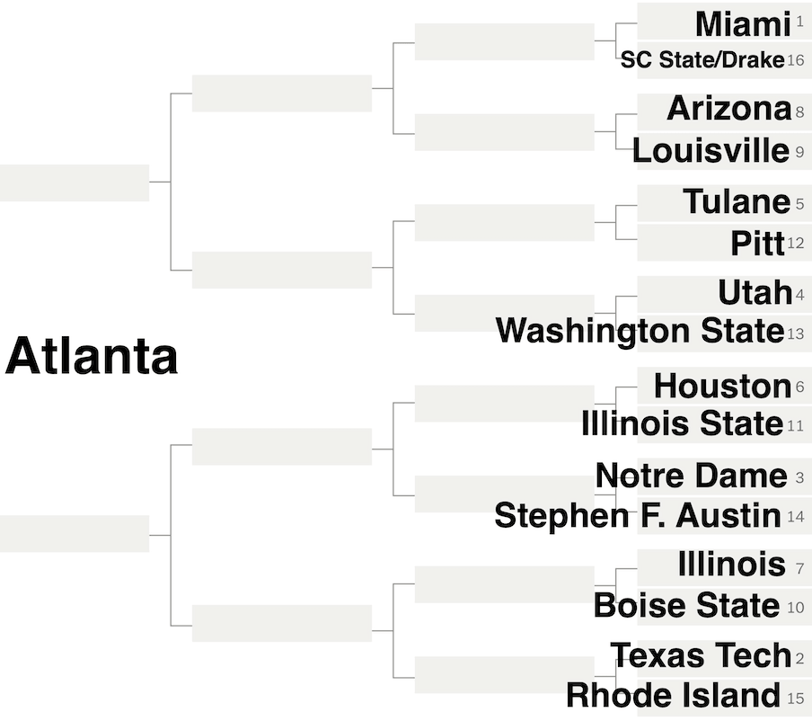 Back to the bracket. In Atlanta, overall No. 2 Miami could get early revenge on Louisville, a rematch the committee had a hard time avoiding despite looking at that part of the spreadsheet for at least 10 seconds. The winner of this group will certainly be Illinois State, the team that won an unprecedented four road games in the FCS playoffs.