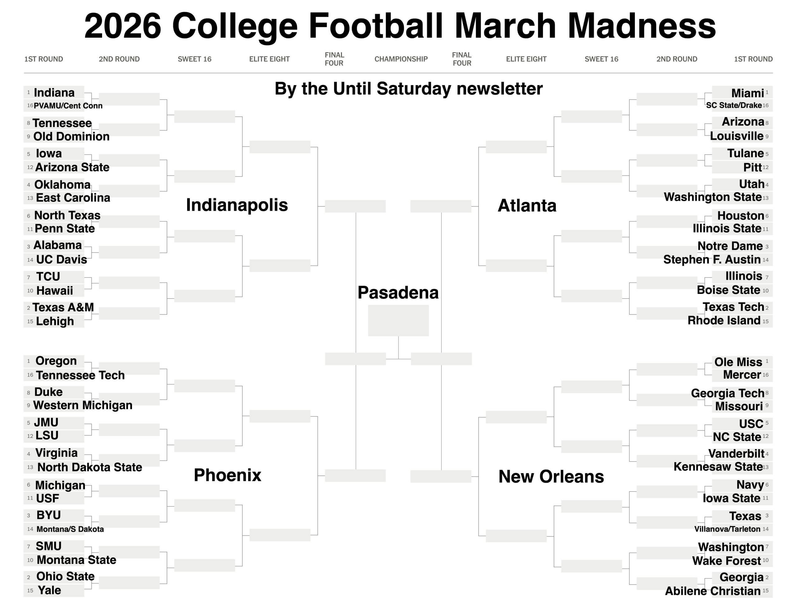 I would ask who ya got winning the whole thing, but we’d all just pick Indiana. After all, football is the sport where the Hoosiers actually win brackets. Still, email me at untilsaturday@theathletic.com, if you want.