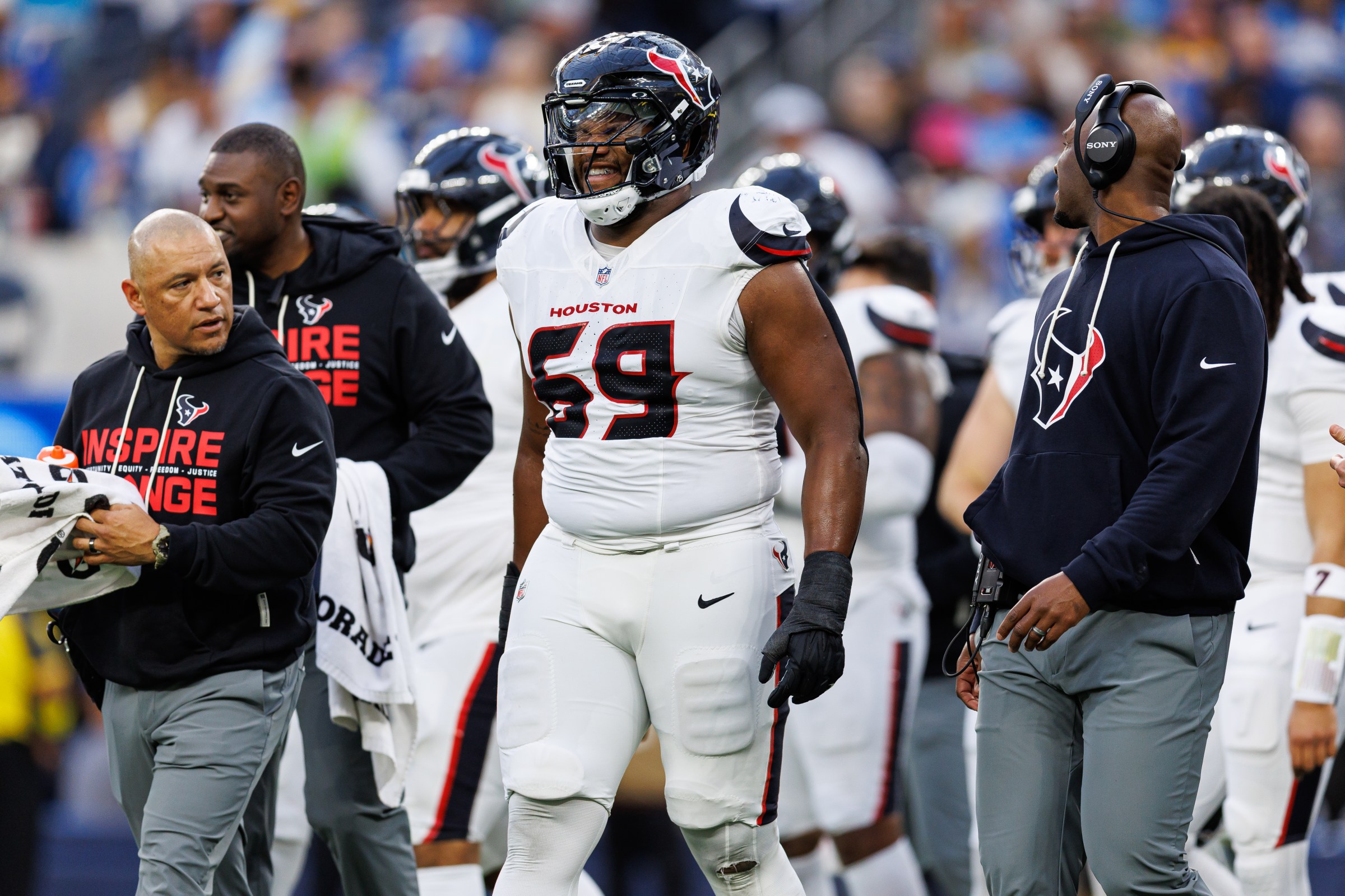 INGLEWOOD, CALIFORNIA – DECEMBER 27: Ed Ingram #69 of the Houston Texans walks off the field due to an apparent injury during the second quarter of an NFL football game against the Los Angeles Chargers at SoFi Stadium on December 27, 2025 in Inglewood, California. (Photo by Brooke Sutton/Getty Images) Getty Images