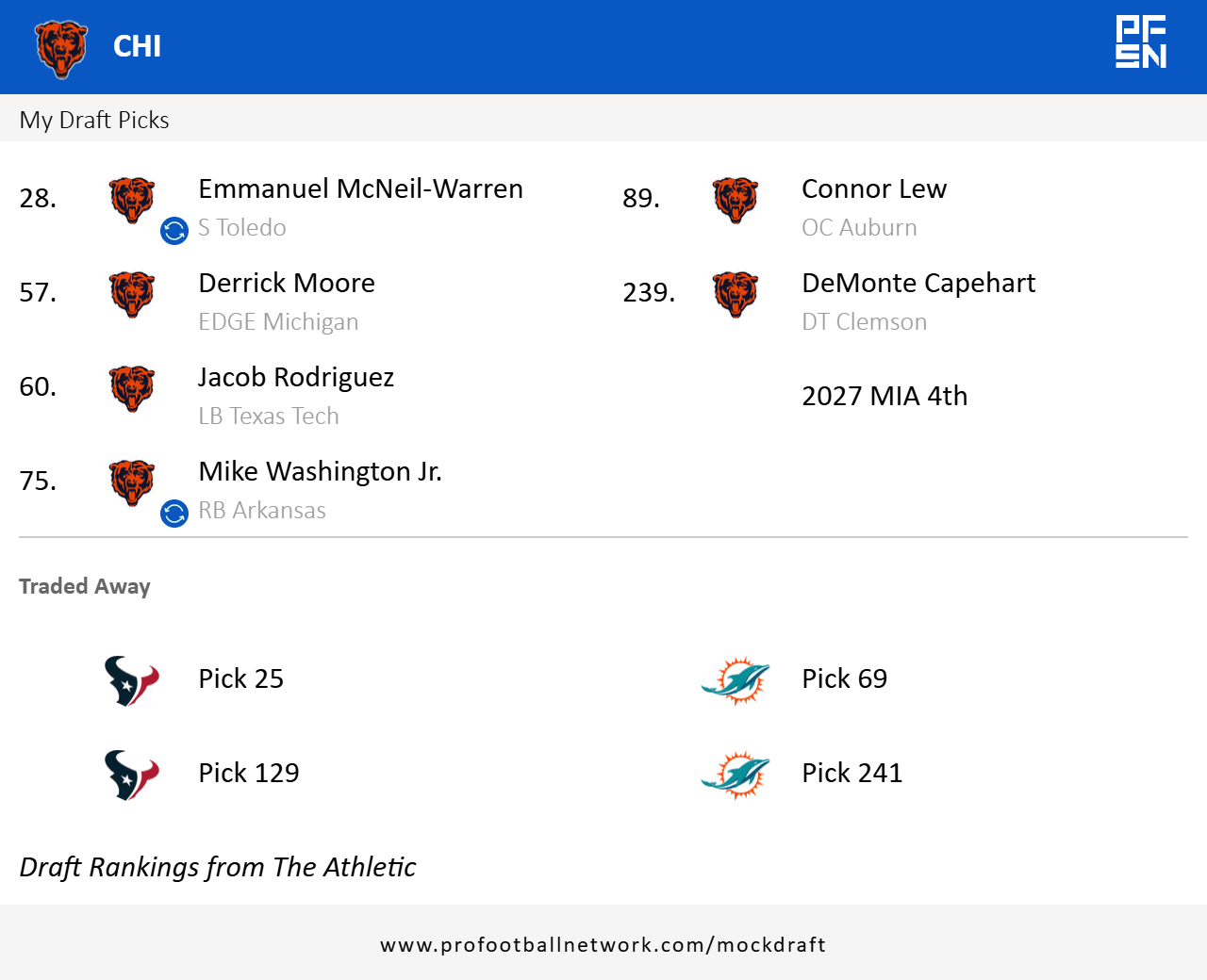 I challenge everyone else—using the same simulator (profootballnetwork.com) and the same board (The Athletic), try to put together a draft that is better for the team Chicago will be, with the coaches it has, in the 2026 season.