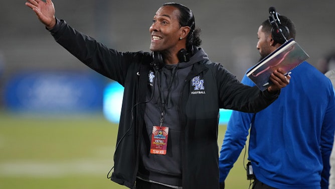 PASADENA, CALIFORNIA – NOVEMBER 28: Santa Margarita Catholic Eagles coach T.J. Houshmandzadeh watches from sidelines during the CIF Southern Section Division 1 football championship against the Corona Centennial Huskies at Rose Bowl Stadium on November 29, 2025 in Pasadena, California. (Photo by Kirby Lee/Getty Images)