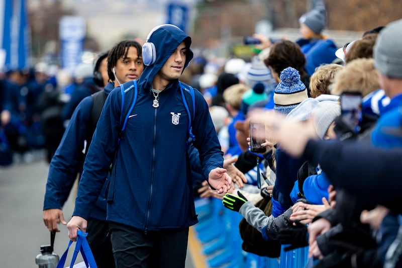 BYU wide receiver Tei Nacua (0) greets fans as he and the rest of the Cougars make their entrance during the Cougar Walk before a game against the UCF Knights held at LaVell Edwards Stadium in Provo on Saturday, Nov. 29, 2025. | Isaac Hale, Deseret News