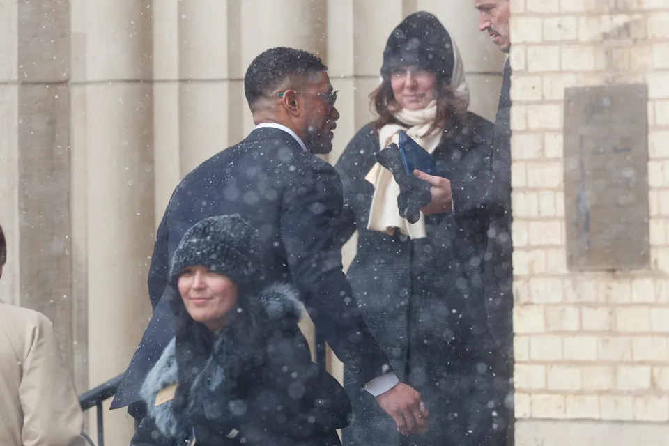 Notre Dame head football coach Marcus Freeman arrives at the funeral service for former head coach Lou Holtz at the Basilica of the Sacred Heart at the University of Notre Dame on Monday, March 16, 2026, in South Bend. Holtz died on March 4, 2026.