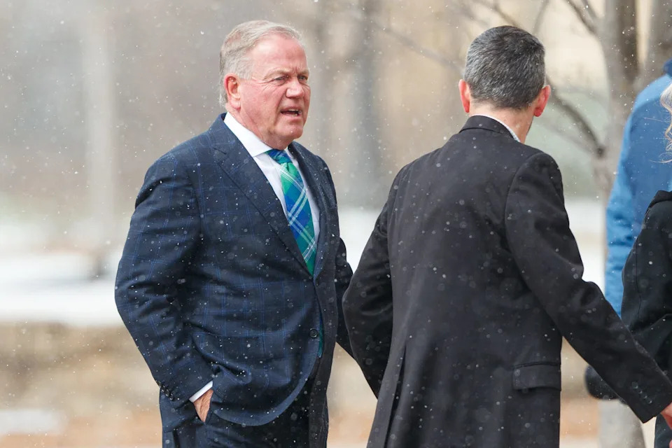 Brian Kelly, left, arrives at the funeral service for former Notre Dame football head coach Lou Holtz at the Basilica of the Sacred Heart at the University of Notre Dame on Monday, March 16, 2026, in South Bend. Holtz died on March 4, 2026.