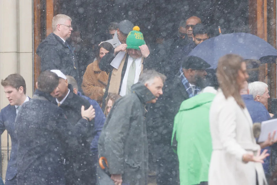 Attendees process out of the funnel service for former Notre Dame football head coach Lou Holtz at the Basilica of the Sacred Heart at the University of Notre Dame on Monday, March 16, 2026, in South Bend. Holtz died on March 4, 2026.