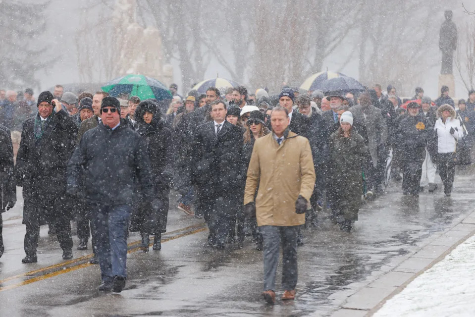 The funeral procession for former Notre Dame football head coach Lou Holtz walks down North Notre Dame Avenue on Monday, March 16, 2026, in South Bend. Holtz died on March 4, 2026.