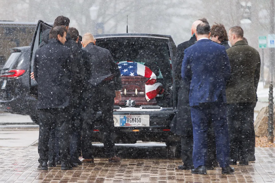 The casket of former Notre Dame football head coach Lou Holtz arrives at the Basilica of the Sacred Heart for his funeral service at the University of Notre Dame on Monday, March 16, 2026, in South Bend. Holtz died on March 4, 2026.