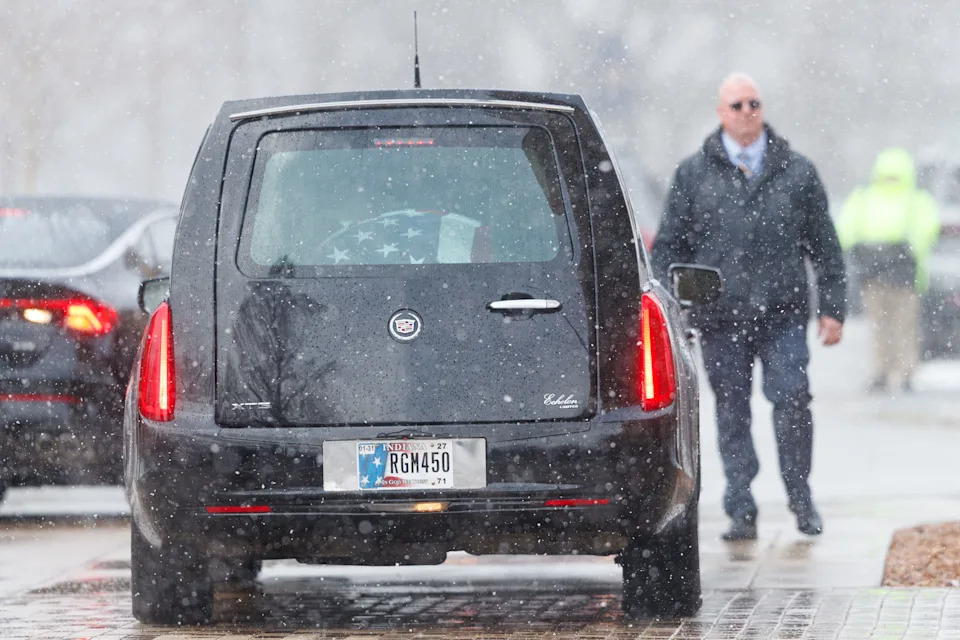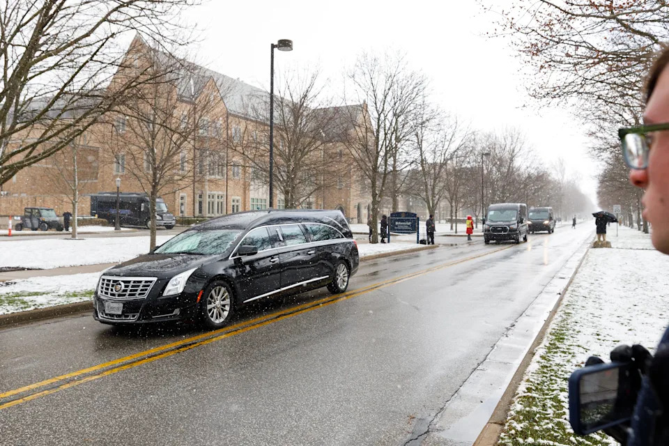 The hearse carrying former Notre Dame football head coach Lou Holtz arrives for his funeral service at the Basilica of the Sacred Heart at the University of Notre Dame on Monday, March 16, 2026, in South Bend. Holtz died on March 4, 2026.