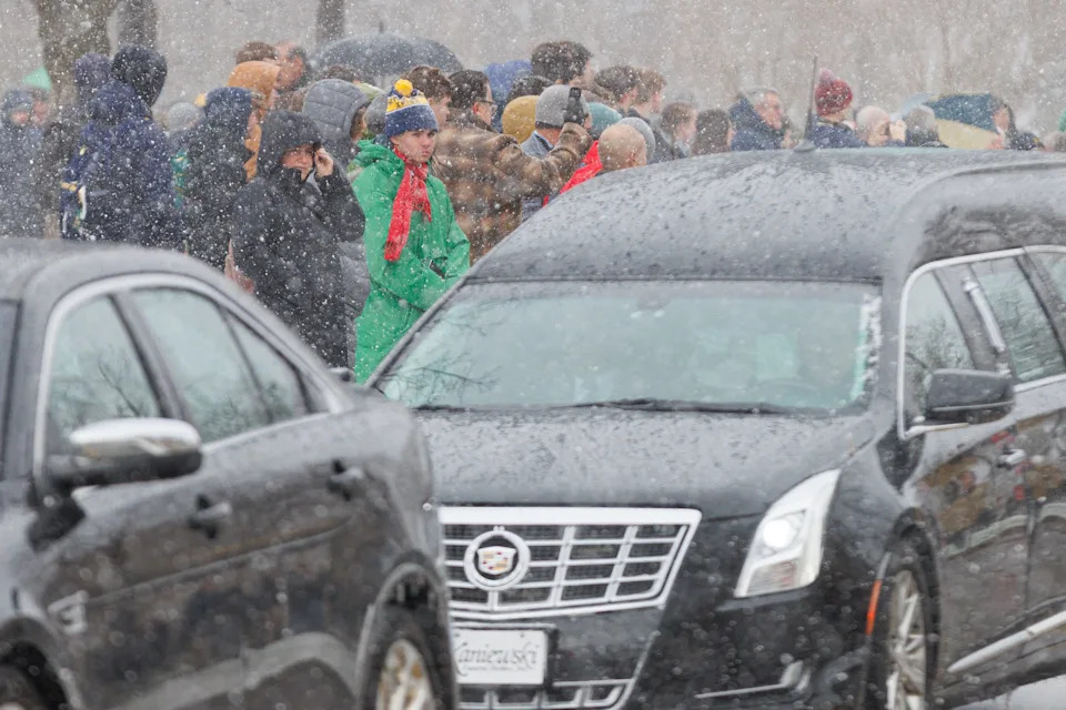 People line up to watch the funeral procession for former Notre Dame football head coach Lou Holtz at the University of Notre Dame on Monday, March 16, 2026, in South Bend. Holtz died on March 4, 2026.